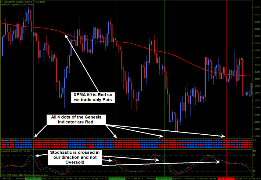 The purpose of the Stochastic is to keep us out of trades where the move is exhausted so we will not place Puts if the Stochastic is Oversold (below the 30 level) and we will not place Calls if Stochastic is Overbought (above the 70 level). You also need the Stochastic to be crossed in your direction. Here’s the summary of the rules:
